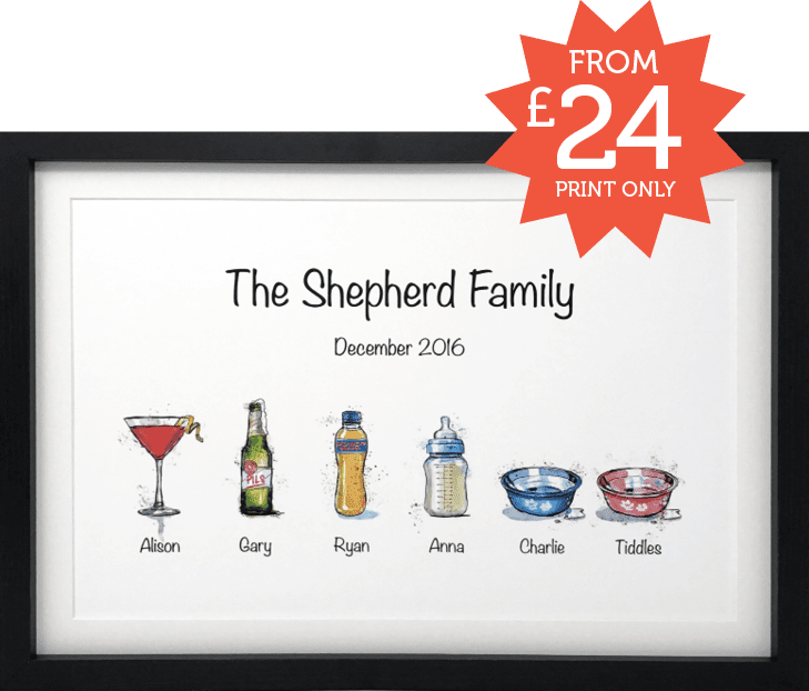 Put your family in the frame with our Family of Drinks print. We've got loads of drinks to choose from including a great selection of soft drinks and pet bowls. Available in A4 and A3 sizes and with a choice of print only or framed.